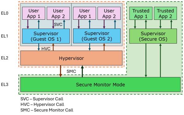 In the image, all of the exception levels are visualised. The Orange area is so-called the untrusted or non-secure state. The region with a blue background is the Operating System and its parts and applications. User applications can request resources using SVC (supervisor calls), or on Raspberry Pi OS (and others), this is called SysCalls. The operating system is treated as a separate program on the exception level EL1 from the EL2 perspective. If the hypervisor is available, the OS may request resources via HVC (Hypervisor calls), and the hypervisor can request resources from the secure monitor via SMC (Secure monitor calls). On Raspberry Pi 5, the bootloader runs on EL3, loading memory and initialising the hardware. Then the operating system is started at the EL1 level, and the rest of the applications in the OS are at the EL0 level. Raspberry Pi 5 does not have hypervisor software, which is why Exception Level 2 is not used. The Green region is a Secure State where only special secure applications and operating systems are executed. This may be used in system duplication, where two identical systems must run, with the second used for integrity checks, fault and error detection in the central system that runs in a non-secure state. Note that both secure and non-secure states are isolated, and the resources can be shared only through the EL3 level.