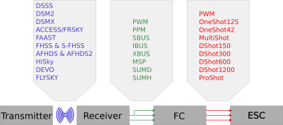 As from the beginning, RC was used to control actuators directly (usually control surfaces), so actuators communication protocols were and still are an essential part of the on-board communication. In Figure 2 we present a list of protocols and their assignment to the sections of the control sequence.