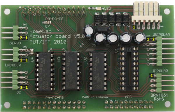 DC motors are connected to the connector group DC. Every pair can handle one motor - all together 4 DC motors. Motors are controlled with widely used H-bridges, L293D dual H-bridge driver is used for the DC motors. Motors can also be replaced by some other actuator which can be controlled digitally and if the current do not exceed 500 mA (piezo generator, relay etc.)