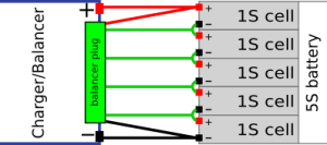 In the case of charging the serial-connected battery packs, charging requires a separate balancing of each cell and usually requires a so-called microprocessor charger. RAW battery packs composed of more than 1 cell have two terminals: main and auxiliary for load balancing (figure 2). The connection for charging the sample 5S battery is present in figure 3.