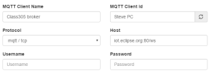 Here you have to configure the client to connect with your selected MQTT broker. The important fields are on the picture below, you can leave the rest on their default settings.