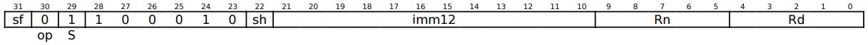 2.The ADDS (ADD) instructions with immediate value: In machine code, it is possible to determine the maximum value that can be added to a register. The ‘imm12’ bits limit the value to 0-4095. Besides that, the ‘sh’ bit allows to shift left (LSL) the immediate value by 12 bits.