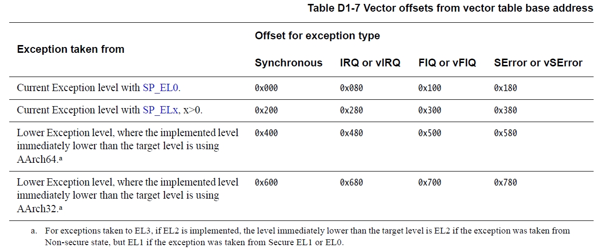 Each exception type needs its own handler, the special function that handles an exact event. Also, separate handlers should be defined for each different exception level at which an exception is generated. If the current code is working on EL1, those states can be defined as follows: the EL1t Exception is taken from EL1, while the stack pointer is shared with EL0. This happens when the SPSel register holds the value 0. EL1h Exception is taken from EL1 at the time when the dedicated stack pointer was allocated for EL1. This means that SPSel holds the value 1. EL0_64 Exception is taken from EL0 executing in 64-bit mode, and EL0_32 Exception is taken from EL0 executing in 32-bit mode. In total, 16 exception handlers must be defined (four exception levels multiplied by four execution states). A special structure that holds addresses of all exception handlers is called the exception vector table, or just the vector table. The AArch64 Reference Manual has information about the vector table structure. Each exception vector has its own offset: