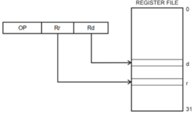 Operands are contained in the source register (Rr) and destination register (Rd). The result is stored in the destination register (Rd).