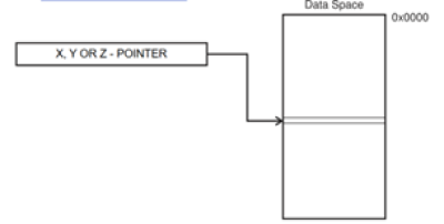 The operand address is the contents of the X-, Y-, or Z-pointer. Data Indirect Addressing is called Register Indirect Addressing in AVR devices without SRAM.