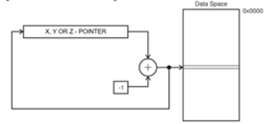 The X,- Y-, or the Z-pointer is decremented before the operation. The operand address is the decremented contents of the X-, Y-, or the Z-pointer.