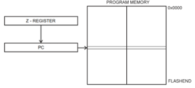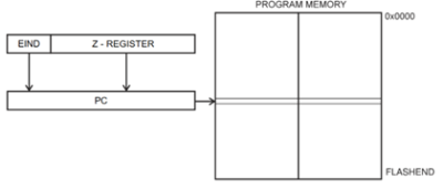 Program execution continues at the address contained by the Z-register and the EIND-register (i.e., the PC is loaded with the contents of the EIND and Z-register).