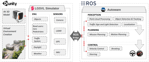 Simulation has been widely used in vehicle manufacturing, particularly for mechanical behavior and dynamical analysis. However, AVs need more than that due to their nature. Simulation in various complex environments and scenarios included other road users with different sensors combination and configuration enables us to verify their decision-making algorithms. One of the most popular robotic simulator platforms is Gazebo. It is based on ROS and utilizes physics engines and various sensor modules suitable for autonomous systems. Nevertheless, Gazebo lacks modern game engine features like Unreal and Unity which gives the power to create a complex virtual environment and realistic rendering.