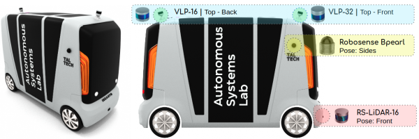 The iseAuto 3D model and its lidar sensors are illustrated in the below figure. Two Velodyne VLP-16 and VLP-32 are installed at the top back and front of the vehicle respectively. Furthermore, two Robosense Bpearl are installed at the sides left and right of the vehicle. Finally, one Robosence LiDAR-16 is installed at the front bottom of the vehicle to cover the front blind zone. This lidar configuration can create a good point cloud coverage around the vehicle for perception purposes.