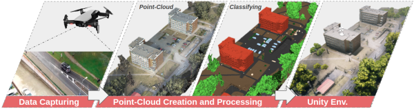 In order to create a virtual environment as a testbed for simulating the shuttle, we selected the aerial mapping approach to map the desired environment. In this way, a drone is used to capture images from the real environment, then multiple software techniques are utilized to convert them to a unity terrain. The images are captured at a grid-based flight path. This ensures that the captured images contain different sides of a subject. Taking aerial photos is one of the most important steps in the mapping process as it will significantly affect the outcome of the process and the amount of work to be done to process those images. The images taken are georeferenced by the drone. The onboard IMU provides the pictures with the orientation so that later they can be stitched together and used for photogrammetric processing. Third-party software aligns and creates the dense point cloud from the pictures that were captured. Once the dense point cloud is created, the segmentation and classification of the points are needed in order to separate unwanted objects and vegetation from the point cloud data. The below figure shows the three main steps to generate the Unity train from geospatial data.