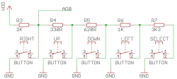 Skeem töötab tavaolekus pull-up takistina (R3) analoog viigule A0. Kui üks lülititest vajutatakse alla, siis hakkab skeem toimima kui pingejagur. Olenevalt millist lülitit vajutatakse tekib maa ja analoogsisendi vahele erinev takistuse suurus. Näiteks nupu “LEFT” vajutamisel on kogutakistus R = 330Ω + 620Ω + 1kΩ = 1,95kΩ. Mida suurem on maa ja analoogsisendi vaheline takistus, seda suurem on ka ADC väärtus.