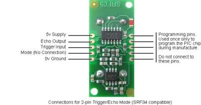 Kodulabori Andurite mooduli komplektis on Devantech SRF04 või SRF05 ultraheli kaugusmõõdik. SRF04/SRF05 on ainult andur, mis otseselt kauguse infot ei väljasta. Anduril on peale toiteviikude veel päästiku ja kaja viik. Päästiku viiku kõrgeks seades genereerib andur 8-perioodilise 40 kHz ultraheli laine. Sel hetkel läheb kõrgeks kaja viik ja jääb kõrgeks niikauaks, kuni peegeldunud helilaine on andurini jõudnud. Seega põhimõtteliselt näitab kaja signaal aega, mille jooksul heli levib objektini ja tagasi. Mõõtes seda aega, korrutades seda heli levimise kiirusega ja jagades kahega, saab leida objekti kauguse. Päästiku, helilaine kiirguri ja kaja signaale ajas iseloomustab kõrvalolev graafik.