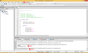 Kui projekt on loodud, ilmub vasakule projektipuusse uus projekt koos näitekoodiga. Kompileerimine käib CodeBlocksis ülal real olevate hammasratta ikoonidega või klahviga F7. Kui kompileerimine õnnestub kuvatakse all Build Log aknas kasutatud programmimälu maht ning ebaõnnestumise korral veateated.