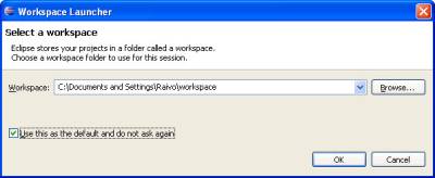 1. Avada Eclipse (Robotic HomeLab IDE) ja alustada uue projekt seadistamist. Kui Tarkvara on äsja paigaldatud on esmalt vaja tekitade projektide repositoorium ehk Workspace. Selleks avage avanenud aksna Workbench ja näidake asukoht, kuhu soovite projektide repositooriumi luua.