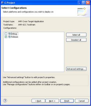 3. Järgnevalt avaneb aken, kus tuleb märkida mikrokontrolleri tüüp ja taktsagedus. Kodulaboris (v5) mikrokontrolleriks on ATmega2561 ja taktsageduseks 14745600 Hz. Projekti lõplikuks loomiseks vajutada nupule Finish.
