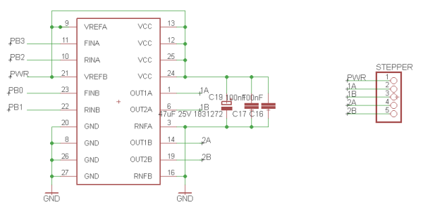 Alalisvoolumootorid ühendatakse DC viikude gruppi. Iga paar suudab hakkama saada ühe mootoriga - kokku 4 alalisvoolumootorit. Mootorite juhtimiseks kasutatakse bd6226fp topelt H-silda. Mootoreid on võimalik asendada ka mõne muu seadmega, mida on võimalik digitaalselt juhtida ning mille poolt tarbitav vool ei ületa 1 A ja pinge 18 V (piezo generaator, relee vms).