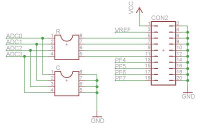 Andurid on ühendatud läbi jumperi, võimaldades kontrolleri sisendisse suunata, kas välise anduri signaali (ühendatud pistikusse X1/COM2) või plaadil oleva anduri signaali. Vaikimisi on analoog sisenditega (PF0-PF3) ühendatud kõik plaadil olevad andurid.