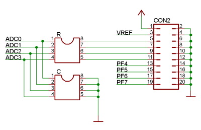 Andurid on ühendatud läbi jumperi, võimaldades kontrolleri sisendisse suunata, kas välise anduri signaali (ühendatud pistikusse X1/COM2) või plaadil oleva anduri signaali. Vaikimisi on analoog sisenditega (PF0-PF3) ühendatud kõik plaadil olevad andurid.