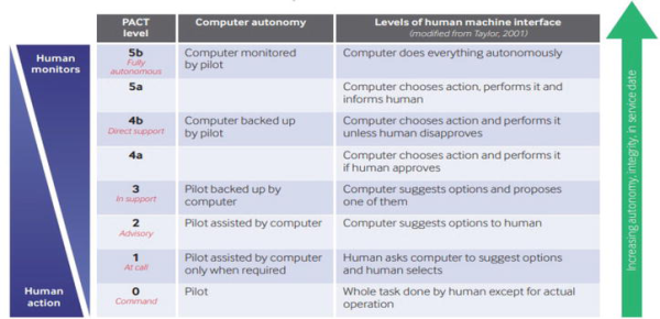 In general, autonomy or autonomous capability is defined in the context of decision-making or self-governance within a system. According to the Aerospace Technology Institute (ATI), autonomous systems can essentially decide independently how to achieve mission objectives, without human intervention [2]. These systems are also capable of learning and adapting to changing operating environment conditions. However, autonomy may depend on the design, functions, and specifics of the mission or system [3]. Autonomy can be broadly viewed as a spectrum of capabilities, from zero autonomy to full autonomy. The Pilot Authorization and Task Control (PACT) model assigns authorization levels, from level 0 (full pilot authority) to level 5 (full system autonomy), also used in the automotive industry for autonomous vehicles (see Figure 2).