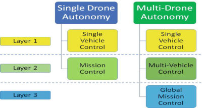 The classification of autonomy levels in multi-drone systems is somewhat different. In multi-drone systems, several drones cooperate to perform a specific task. Designing multi-drone systems requires that individual drones have an increased level of autonomy. The classification of autonomy levels is directly related to the division into flights performed within the pilot's or observer's line of sight (VLOS) and flights performed beyond the pilot's line of sight (BVLOS), where particular attention is paid to flight safety. One way to address the autonomy issue is to classify the autonomy of drones and multi-drone systems into levels related to the hierarchy of tasks performed [7]. These levels will have standard definitions and protocols that will guide technology development and regulatory oversight. For single-drone autonomy models, two distinct levels are proposed: the vehicle control layer (Level 1) and the mission control layer (Level 2), see Figure 4. Multi-drone systems, on the other hand, have three levels: single-vehicle control (Level 1), multi-vehicle control (Level 2), and mission control (Level 3). In this hierarchical structure, Level 3 has the lowest priority and can be overridden by Levels 2 or 1.