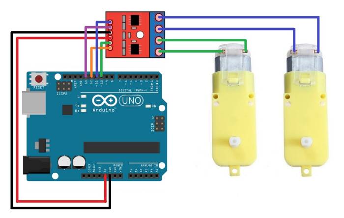 /* Example #5.1 */ // Set pins for driver inputs const int left_A = 10; // driver pin A-1A const int left_B = 12; // driver pin A-1B const int right_A = 11; // driver pin B-1A const int right_B = 13; // driver pin B-2A void setup() { // Set driver control pins as output pinMode(left_A,OUTPUT); pinMode(left_B,OUTPUT); pinMode(right_A,OUTPUT); pinMode(right_B,OUTPUT); motors(0,0); // stop motors delay(2000); // halt program for safety purposes 2 seconds } void loop() { motors(1,1); // robot goes forward delay(2000); // halt program for 2 seconds motors(-1,1); // robot turns left delay(500); // halt program for 500 milliseconds } // This function controls the driver input pins to get correct motion void motors(int left, int right) { // Left Motor if(left == 1) { // Left motor CW digitalWrite(left_A,HIGH); digitalWrite(left_B,LOW); } else if(left == -1) { // Left motor CCW digitalWrite(left_A,LOW); digitalWrite(left_B,HIGH); } else { // Left motor STOP digitalWrite(left_A,LOW); digitalWrite(left_B,LOW); } // Right motor if(right == 1) { // Right motor CW digitalWrite(right_A,HIGH); digitalWrite(right_B,LOW); } else if(right == -1) { // Right motor CCW digitalWrite(right_A,LOW); digitalWrite(right_B,HIGH); } else { // Right motor STOP digitalWrite(right_A,LOW); digitalWrite(right_B,LOW); } }