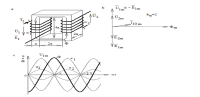 Realisation of a three-phase electric motor uses the principle of rotating magnetic field. The motor could operate according to synchronous or asynchronous principle. Three windings shifted in space for 1200 are supplied from a three-phase AC voltage system uA, uB, uC with an angular speed of rotating voltage vectors ω (fig.3.9). When 0<ωt<60 deg. voltages uA and uC are positive, but uB negative. It means that the current in the conductors of the 1st and 3rd windings are directed from the reader, but the 2nd – to the reader. Thus a clockwise inclination of magnetic flux appears around the beginning of the 1st and 3rd windings and the end of the 2nd winding. A magnetic flux inclining in an opposite direction appears around the ends of the 3rd and 1st windings and the beginning of the 2nd one. The direction of the total vector of the magnetic flux is shown in fig. 3.9.b.