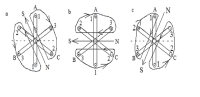 Fig.3.10. Rotating magnetic field at reverse of the connection of supply wires A synchronous motor contains a stator with three windings and rotor representing a permanent magnet (fig.3.11). Fig.3.11,a shows the situation when the total vector of magnetic flux is of the up-right position and the rotor turns for the angle of 30 deg. clockwise. The total vector of the stator winding rotates in a clockwise direction then the rotor turns in the same direction. A synchronous motor could get a problem with initially connecting it to supply voltage. As the rotor has a high level of inertia it will not start its rotation immediately and in a half-period the total vector of the flux makes the rotor to turn into the opposite direction (fig.3.11.b).