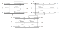 The primary and secondary windings could have also Δ-connection (fig.3.14). Because of that reason the secondary winding in figure fig.3.14,a has no zero wire. In fig.3.14,b the primary is Δ-connection, but the secondary Y-connection. In fig.3.14,c both windings are of Δ-type. If primary windings are of Y-connection the winding of each phase should be calculated according to the phase-to-zero voltage: