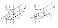 In fig.3.4,a the position given in the direction of the current in the conductor 1-2, according to the left hand rule provides the movement of this edge to the left. The current of conductor 3-4 moves it to the right providing thus counter clockwise movement of force F. The value of the force is maximum when the frame is in vertical position.