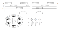 The third motor realisation is based on the conception of a ferromagnetic body placed in a magnetic field and its attraction to the state of minimum magnetic reluctance. The rotor in this case is a kind of cross-section made of a type of iron (fig.3.8), but the stator is a system containing three poles pairs. If voltage is supplied to pole A the rotor is not moving. If pole A is disconnected and pole B is connected to the supply the rotor turns for 30 degrees in a clockwise direction. Further disconnecting B and connecting C the rotor turns for 300 more, etc. This kind of motor is called reluctance motors, i..e. magnetically controlled modulator.