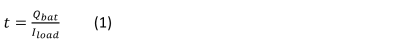 The second most important quantitative battery parameter is capacity Qbat. Capacity determines how much charge a battery can store. It is measured in amp hours (Ah). Higher Ah rating means the battery will be able to run longer before requiring a recharge. If the load current Iload is known then the runtime t can be calculated as follows: