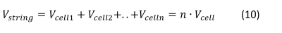 Each battery module or a small battery pack consists individual cells. All cells are of the same model and are preferably parameter-matched to provide maximum performance utilization. There are two types of connections which can be used to combine individual cells: series connection and parallel connection. In a series connection cells are connected in a string so that positive pole of one cell is connected to the negative pole of the next cell. The correct polarity is critical. Series connection is used to increase voltage of the pack. A single cell has nominal voltage of 1.2V to 3.8V. Higher voltages can be obtained by series connecting cells. Voltage of a string is the sum of individual cells. n is the number of series connected cells.
