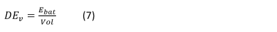 While specific energy describes the relative weight of the battery, volumetric energy density is used to describe the relative volume or size of the battery. A battery with higher volumetric energy density will be smaller at the same rated energy. The volumetric energy density DEv can be calculated using (x) where Ebat is the nominal energy and Vol. is the volume measured in liters l. The result is expressed in Wh/l units. A battery datasheet most likely will provide the mass however the volume will have to be calculated using provided dimensions. High-performance LIBs can have volumetric energy density of 400Wh/l or even more.