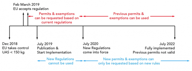 Between May and July of 2019, the new regulations will be published. The national CAA’s then have one year to implement these regulations before these come into force in July 2020. Up until that date, it is still possible to operate under the current regulations and even apply for a permit/exemption based on these regulations. From July 2020 onward it is still possible to use previously obtained permits and exemptions for a period of two years up to July 2022. From then on it is only the EU regulations that are applicable.