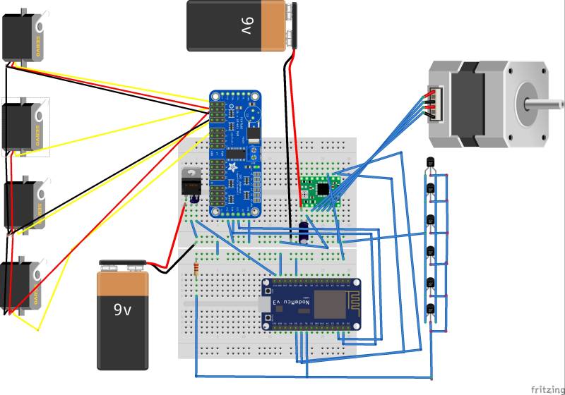 The user can control the lab with five servomotors. With using PWM, the user can realize the change of slats position (4 actuators) and house rotation (1 actuator).