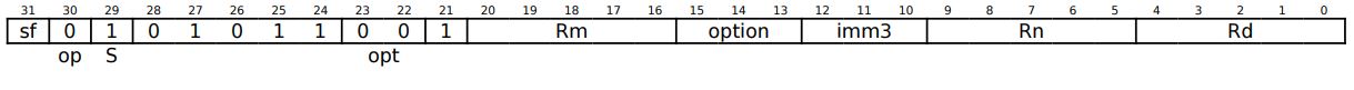 We already know that the ‘sf’ bit identifies the length of the data (32 or 64 bits). The main difference between these two instructions is in the ‘S’ bit. The same is in the name of the instruction. The ‘S’ bit is meant to signal to the processor that the status bits should be updated after instruction execution. These status bits are crucial for conditions. The 30th ‘op’ bit and ‘opt’ bits are fixed and not used for this instruction. The three option bits (13th to 15th) extend the operation. These bits are used to extend the second source (Rm) operand. This is handy when the source operands differ in length, such as when the first operand is 16-bit wide and the second is 8-bit wide. The second register must be extended to maintain the data alignment. Overall, there are three bits: 8 different options to extend the second source operand. The table below explains all these options. Let's look only at those options; the bit values are irrelevant for learning the assembler.