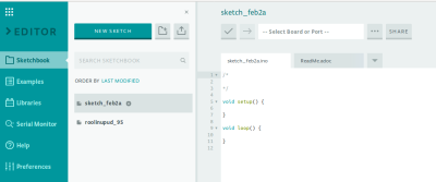Kasutajaliides ja tööriistariba on äärmiselt lihtsad. Kaks peamist funktsiooni: koodi kompileerimine ja koodi laadimine mikrokontrollerisse on esimesed kaks nuppu tööriistaribal ja teised kolm nuppu on standardfunktsioonid: uue visandi tegemine, olemasoleva visandi avamine ja jooksva visandi salvestamine. Pange tähele, et Arduino koodifaile kutsutakse visanditeks (inglise keeles Sketch).