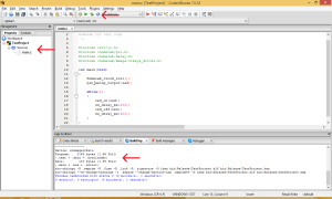 Kui projekt on loodud, ilmub vasakule projektipuusse uus projekt koos näitekoodiga. Kompileerimine käib CodeBlocksis ülal real olevate hammasratta ikoonidega või klahviga F7. Kui kompileerimine õnnestub kuvatakse all Build Log aknas kasutatud programmimälu maht ning ebaõnnestumise korral veateated.