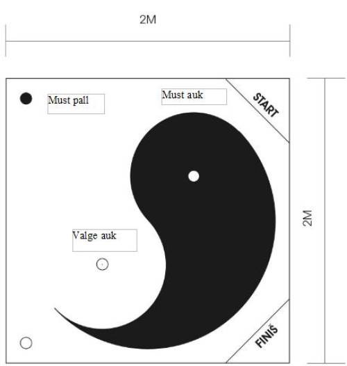 Valgustus – tavaline ruumi valgustus Võistlusala 200 x 200 cm sile plaat kaetuna vineeri vms. materjaliga. Ala servad on ümbritsetud 15 cm kõrguste valgete seintega. Stardi ja finiši kohad on ala nurkades vastavalt joonisele.